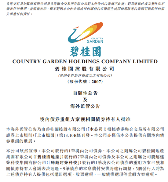 据碧桂园披露,其最后一笔境内债券的重组方案通过了债券持有人会议审议。